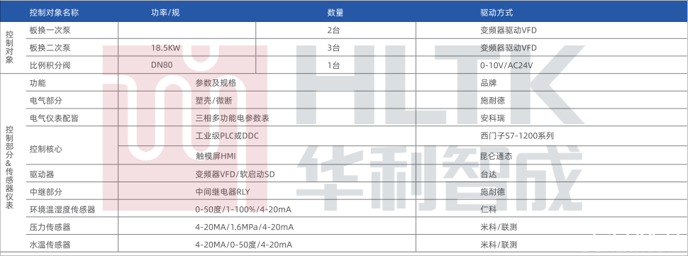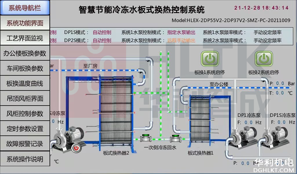 控制系統(tǒng):控制系統(tǒng)通過PLC控制器和控制軟件,用于監(jiān)測板式換熱器二次側(cè)的冷凍水進出口溫度給定一次側(cè)水泵的運行頻率,通過