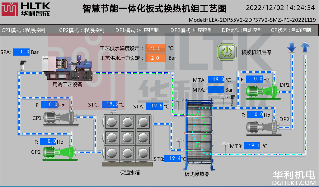 控制水泵的頻率控制流量和溫度,從而實現(xiàn)板式換熱器的二次側(cè)熱流體的精準溫度自動控制。